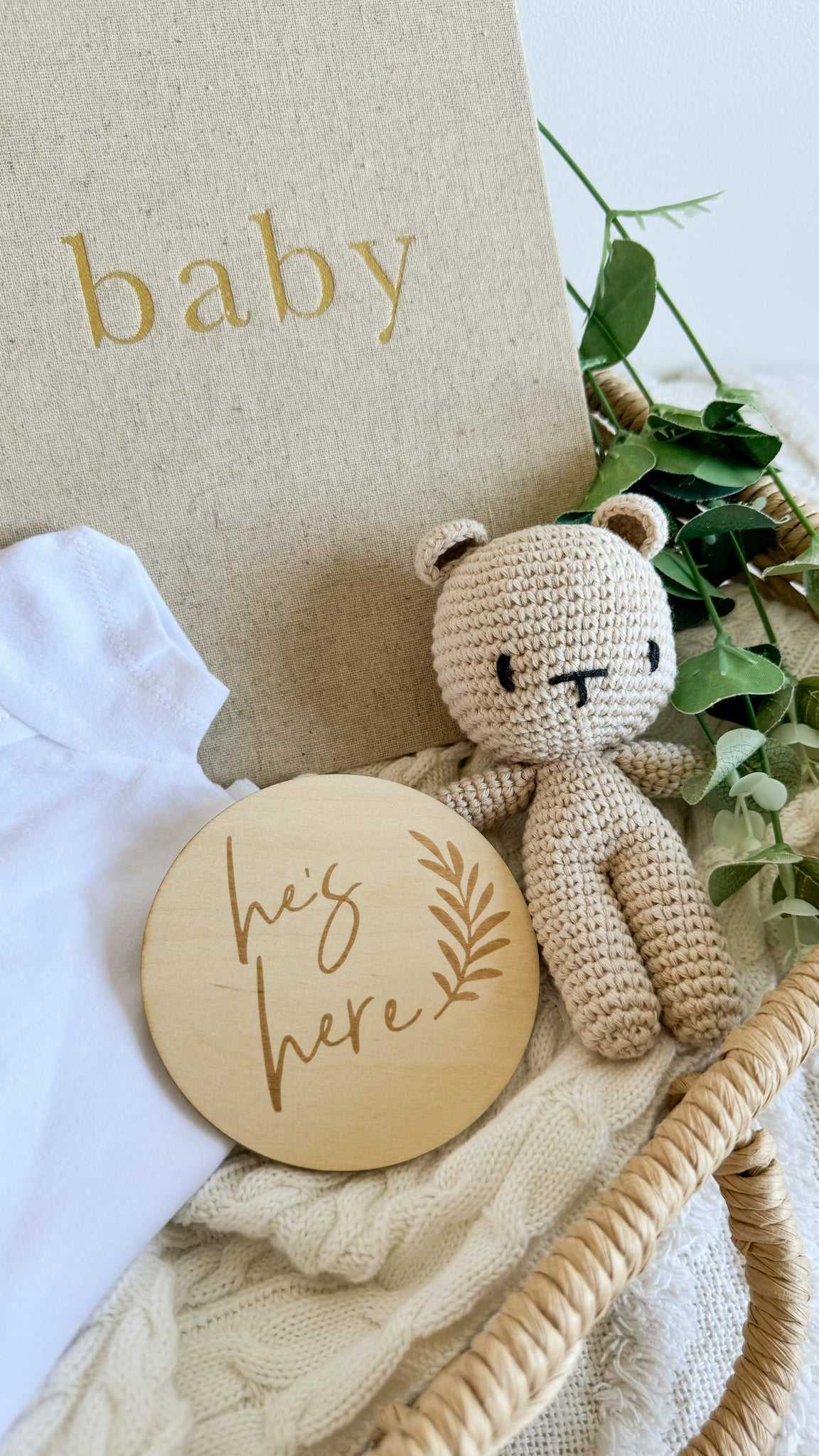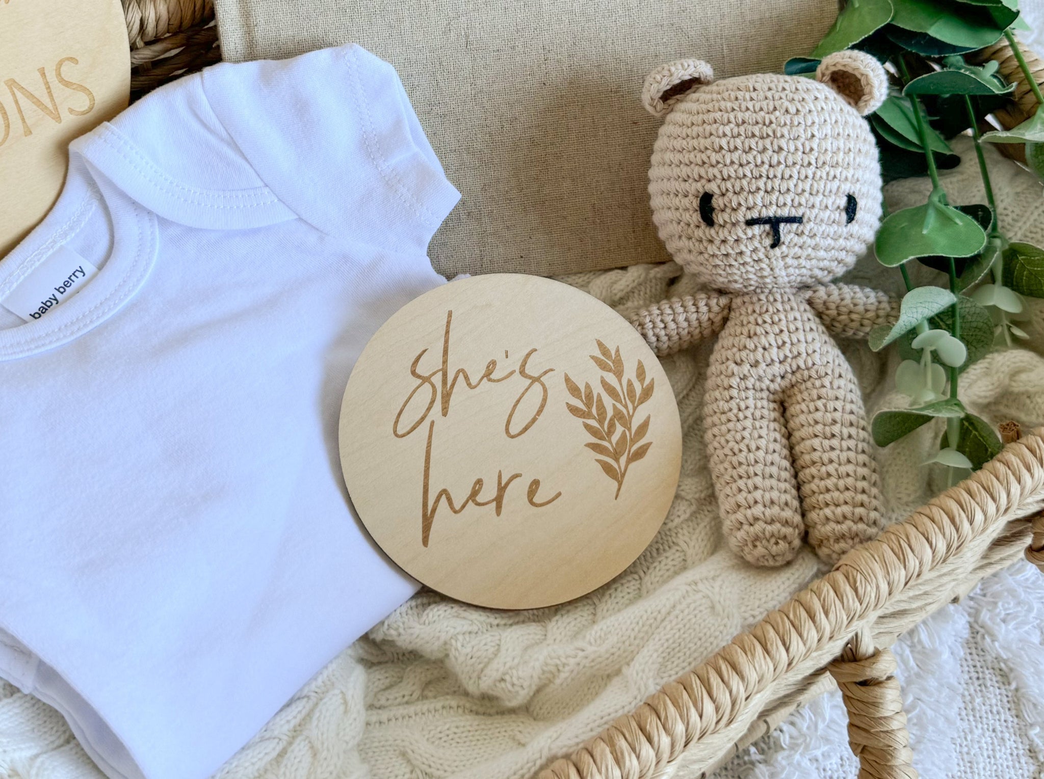 The perfect plaque to add to any birth announcement! This announcement comes as a 2 in 1 with "she's here" on one side and "he's here" on the other! This makes for the perfect plaque for all pregnancies, including those keeping baby's gender a surprise. This plaque is also the perfect keepsake to use with future pregnancies.